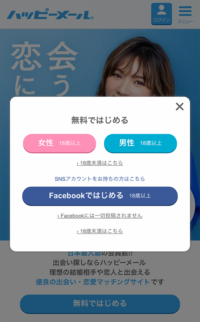 「男性」or「Facebookではじめる」をタップ